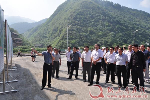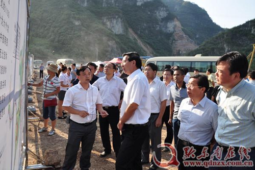 圖為州委書記李飛躍率觀摩組在岑鞏經濟開發區的輕工業園區聽取工作人員介紹城市綜合體和園區規劃建設情況