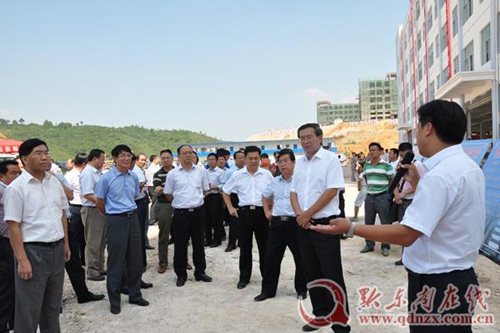 圖為州委書記李飛躍率觀摩組在臺江經濟開發區了解入駐企業建設進度