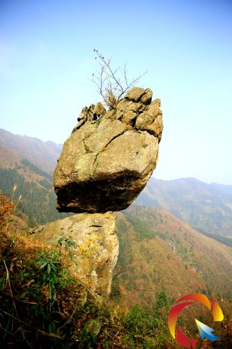 孔明山上被人們稱為“孟獲石”的石頭位于懸崖峭壁之上,重數十噸,與另外一塊石頭僅有幾十平方厘米的接觸面,但其數千年來巋然不動,是當地的一大景觀,來訪的游客無不感嘆。