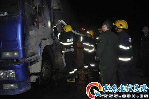 19時29分,消防官兵到達現場。現場后,官兵們迅速對事故現場劃地警戒區域,拉開警戒線。隨后,經現場觀察詢問得知,現場貨車車頭與車廂連接處濃煙滾滾,不時有明火出現。根據現場情況,官兵立即鋪設水帶出水進行滅火與降溫。19時48分,火勢被徹底撲滅。(貴州黔東南施秉縣消防中隊 賀才明)