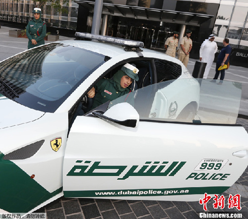 迪拜警方當地時間4月25日在世界最高建筑哈利法塔的底層展出了他們斥資19.4萬英鎊(約合人民幣184.9萬元)購得的豪華警車——法拉利FF跑車。繼本月11日亮相的蘭博基尼之后,迪拜警方又添一員“新秀”。 早在11日,當地警方就在迪拜購物中心展出了價值36萬英鎊(約合人民幣343萬元)的蘭博基尼阿文泰德(Aventador)跑車。新成員法拉利將和蘭博基尼并駕齊驅,共同威懾那些熱衷于超速駕駛的高性能車車主。
