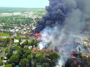 事故發生于6日凌晨1時,這列火車高速沖入魁北克省南部靠近美國緬因州邊界的梅岡蒂克湖小鎮,4節車廂起火,然后爆炸形成一團巨大火球,升起上百米高的煙云。