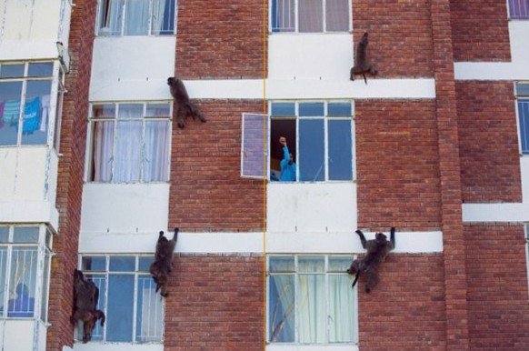 據英國《每日郵報》8月2日報道,近日,南非開普敦的大街上上演了一場人類與狒狒之間的游擊戰,成群的狒狒爬上公寓兩側,撬開窗戶,入室搶劫。而居民只能用彩彈槍和胡椒噴霧器驅逐它們。居民的忍讓使得狒狒們有恃無恐,很多居民的財產都受到嚴重的損失。