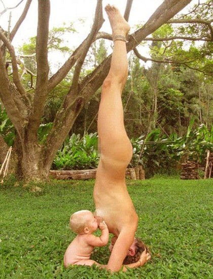 這位母親名叫艾米·伍德拉夫(Amy Woodruff),住在夏威夷的一個允許裸體外出的公社內,當她正在倒立著進行瑜伽練習的時候,跟隨爸爸在草地上玩耍的小女兒納伊亞(Naia)偷偷爬了過來,開始吮吸她的乳汁。
