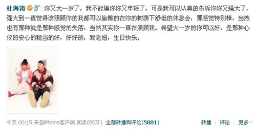 1月29日,《快樂大本營》主持人吳昕30歲生日,快樂家族的五位成員何炅、謝娜、李維嘉、杜海濤與吳昕聚在一起,為她慶生。零點到來的時候,杜海濤為吳昕慶生,稱自己很想照顧吳昕,卻常常被她照顧,因此感到失落,也祝福吳昕能安心的好,言辭曖昧,似在隱晦表白。