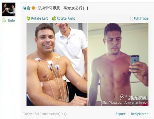 《體壇周報(bào)》知名西甲專家濱巖也在個(gè)人騰訊微博上對(duì)此進(jìn)行了轉(zhuǎn)載,濱巖將羅比在去年9月份剛開(kāi)始減肥時(shí)的照片和最新的自拍截圖進(jìn)行對(duì)比,同時(shí)表示:“堅(jiān)決學(xué)習(xí)羅尼,蒸發(fā)20公斤!!”