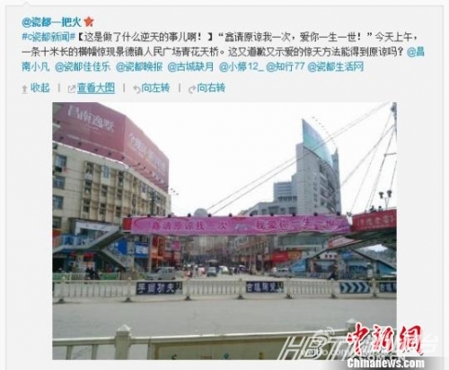 中新網(wǎng)南昌3月3日電(王劍蘇路程)“鑫,請原諒我一次,我愛你一生一世”。3日,有網(wǎng)友微博爆料,在江西景德鎮(zhèn)市,一條長10余米的巨幅告白道歉廣告懸掛在該市鬧市區(qū),有網(wǎng)友調(diào)侃“這是向全市人民保證的承諾。”