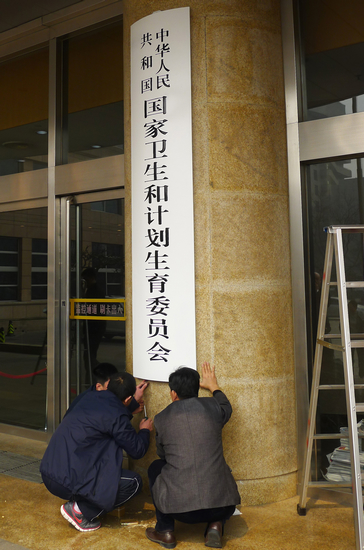 3月17日在北京市西城區西直門外南路1號,懸掛多年的“衛生部”牌子被悄然摘下,取而代之的新牌子上寫的是“國家衛生和計劃生育委員會”。與此同時,在北京市海淀區知春路14號,32年前建立的“國家人口和計劃生育委員會”也完成了歷史使命。國家衛生和計劃生育委員會是根據黨的十八大會議精神要求,按照新一輪“大部制”改革方案及《國務院機構改革和職能轉變方案(草案)》合并組建的一個新機構。將國家人口和計劃生育委員會的研究擬訂人口發展戰略、規劃及人口政策職責劃入國家發展和改革委員會;國家中醫藥管理局由國家衛生和計劃生育委員會管理;不再保留衛生部、國家人口和計劃生育委員會。