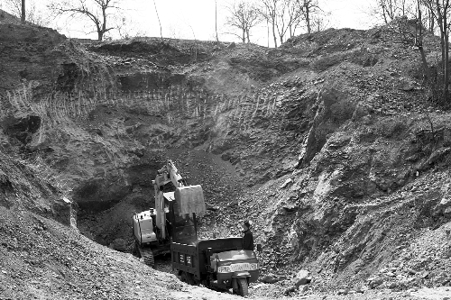 4月7日14時許,記者在許懷申的帶領下,來到了他家林地。只見一個小山包的山體被開膛破肚,巨大的缺口內,一臺挖掘機正在挖礦石。不一會兒,山下來了幾輛運礦石的農用車,挖掘機一鏟鏟將礦石裝進車廂。