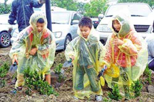 據臺灣《中國時報》報道,臺灣高雄岡山區綠環境館昨(27日)舉行“處心積慮、愛地球”植樹活動,雖然大雨不停、泥濘滿地,仍吸引近百親子及彌陀小學師生響應,大小朋友齊手栽種樹苗,相約來日再見大樹,每人也帶著一株綠色植栽回家。