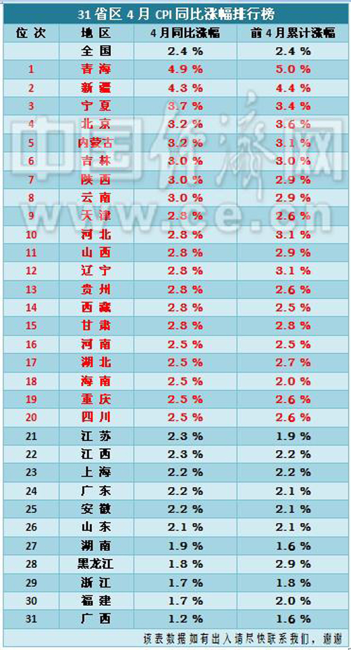 4月份全國CPI同比上漲2.4%,與一季度漲幅持平。中國經濟網記者統計,4月份31省區中,20省區CPI漲幅超全國水平,較一季度新增加一個省區,延續了一季度“高位運行”的態勢。4月份31省區中,青海CPI同比上漲4.9%居首,廣西僅漲1.2%居末,另外北京物價漲幅較一季度有所回落,跌出前三甲。