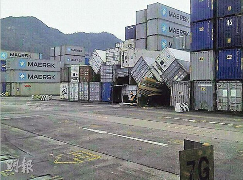 香港一個貨柜場內一疊約5層高貨柜箱,疑不抵強風吹襲,“骨牌式”倒塌。(來源:香港《明報》)