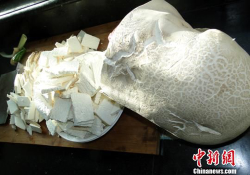 5月22日,隨著一場(chǎng)大雨的到來(lái),新疆生產(chǎn)建設(shè)兵團(tuán)第四師七十團(tuán)三連一居民,在自己家的地頭發(fā)現(xiàn)2個(gè)碩大沒(méi)有根莖的野蘑菇,象個(gè)大卵石躺在他家地頭,其中一個(gè)重達(dá)2.3公斤,另一個(gè)蘑菇里已生蟲(chóng),切開(kāi)后白如雪,密度如苯板,食后口感鮮嫩可口,鮮美味十足。