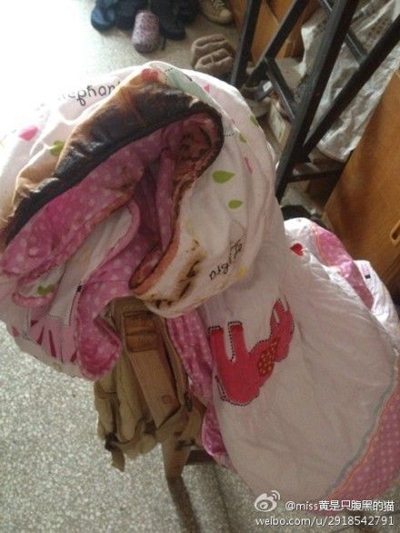 新浪微博@miss黃是只腹黑的貓:去寢室樓頂曬個被子居然糊了!