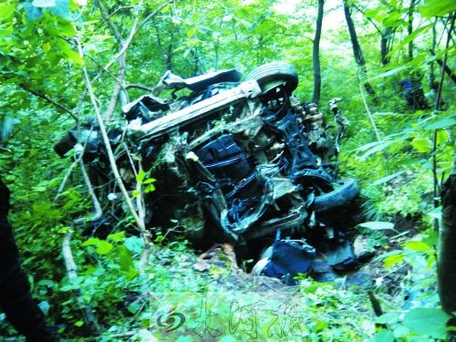 墜入崖底的汽車已摔成一堆廢鐵,乘員也都被甩出車外。