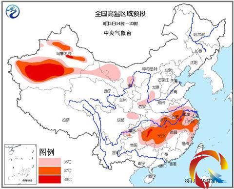 預(yù)計(jì)今天白天,江淮、江漢南部、江南中北部和東部、貴州東部、四川盆地南部和北部、重慶東南部、新疆大部、內(nèi)蒙古西部、寧夏北部、渭河河谷等地有35℃以上的高溫天氣;其中,江淮中部、江漢東南部、江南中北部、北疆南部、南疆盆地、吐魯番盆地等地的部分地區(qū)最高氣溫有37~39℃,湖南西北部、湖北東南部、安徽南部、南疆盆地中南部和吐魯番盆地等地的部分地區(qū)最高氣溫可達(dá)40~41℃。