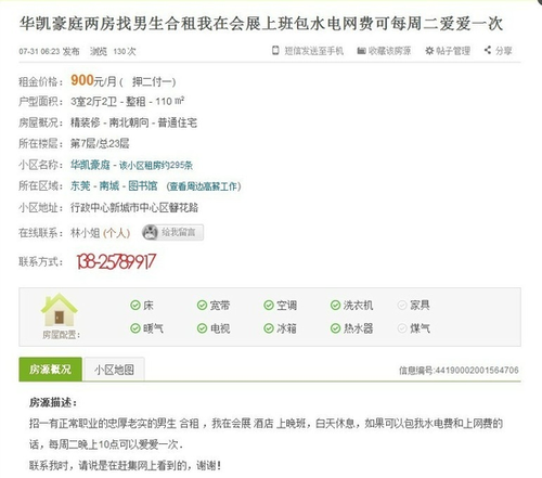 “包水電網費,可每周二愛愛一次。”8月5日,一則署名聯系人為“林小姐”的租房信息在各個網站上火了!點擊率迅速飆升。5日下午5時許,羊城晚報記者發現,合租地點在東莞華凱豪庭,但該信息在上述網站已被刪除,“林小姐”的電話也無人接聽。