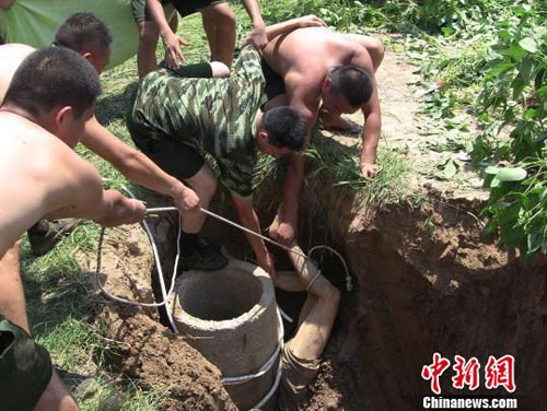 救援官兵到達現場后發現,一老一少被卡在廢棄水井與四周塌方形成的狹小夾縫里,老人一絲不動,已經停止了呼吸,但仍緊握孩子雙臂,孩子在不停哭泣。