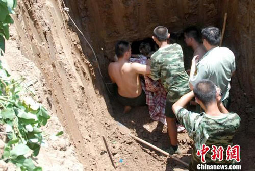 最終,救援人員利用挖掘機在井和塌方夾縫一側的空地,距離被困人員1米處向下挖出5米深的大坑,再橫向用鐵锨鐵鍬小心鑿洞。