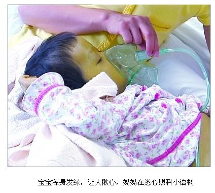 雖然隔著一層厚厚的塑料簾,但記者依舊能看到,語桐小小的臉上泛著綠瑩瑩的光,露在外面的四肢也是綠幽幽,和媽媽黃黃的膚色形成了強烈的反差。“這些天,孩子除了吃飯和大小便,就一直這樣昏睡著。”