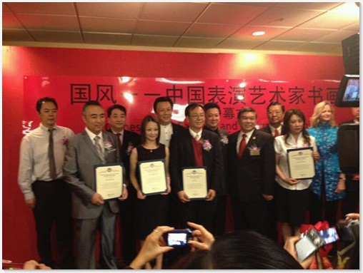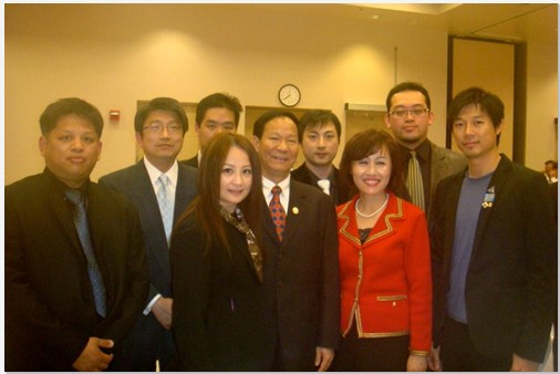 美國嘉美產婦服務顧問公司副總裁葉曼琳女士與應邀出席中國表演藝術家唐國強、姜昆、張鐵林組織見面會活動,此圖為合影
