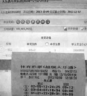 照片上是一彩票網站的大樂透開獎頁面和一張彩票,網頁和彩票上都寫著第13118期,開獎號碼與彩票第一行的數字相同,連順序都完全一樣,中獎金額寫著1000萬元。