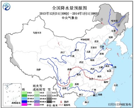 2014年1月1日08時(shí)至2日08時(shí),黑龍江中東部、青海南部等地有小到中雪。內(nèi)蒙古中東部、東北地區(qū)東部有4~5級風(fēng)。南海西南部有6~7級、陣風(fēng)8級風(fēng)。
