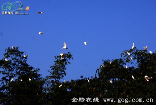 6月16日黃昏時分,筆者在德江縣潮砥鎮石板村烏江岸邊目睹了群鳥歸巢的美麗自然風景,在夕陽照射之下,數千只白鷺有的在江面上空盤旋,有點棲居在岸邊竹林叢中的兩棵相思樹上。