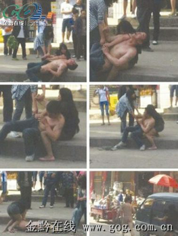 6月15日,一組裸男被兩名女子“扒光”后當街狂奔的圖引爆網絡,其36字的配圖說明,讓“六盤水老城女漢子”的百度關鍵詞搜索多達200條以上。截至記者發稿時,騰訊專業搞笑類微博“糗事百科”轉載該條圖片后,短短9小時內瀏覽量達到35萬次左右,轉載率和評論也突破3400次。目擊者稱圖中男子疑是搶了兩名女子的項鏈,且自解衣衫玩“金蟬脫殼”。