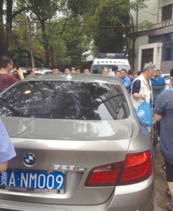“早上8點多,貴醫外科大樓下,一輛寶馬車逆行堵路一個多小時,堵住一輛救護車,車輛一直堵到北京路上,直到媒體記者前來曝光才退走,造成惡劣影響,很多車連醫院大門都進不來。”昨日14:24,新浪網友@貴陽大武微博報料稱,昨日上午,一輛銀色寶馬車將貴醫生命通道堵死一個多小時。