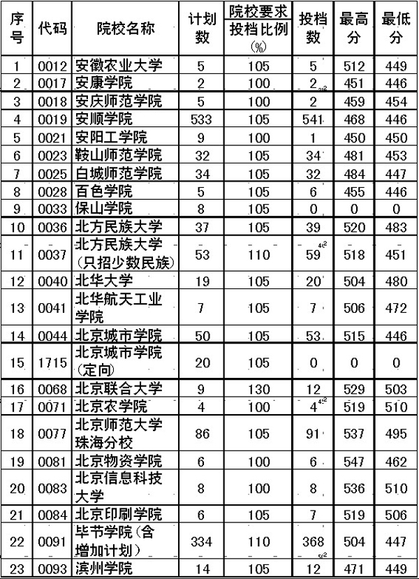 貴州省2013年高考第二批本科文史類平行志愿部分院校投檔情況(7月22日)