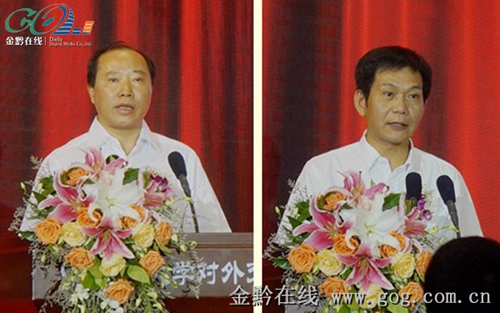 茅臺集團董事長袁仁國(左)和中國青基會秘書長涂猛(右)分別在啟動儀式上講話