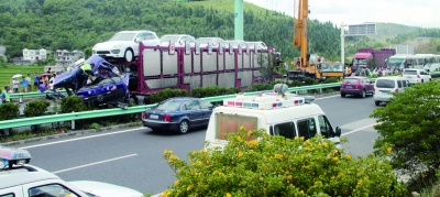 昨天,清黃高速路上距黃果樹收費站150米處發生一起6車連環追尾事故。一輛載有10輛保時捷的大拖掛車,在下坡時來不及剎車失控,與前面5輛轎車連環撞。掛車司機胸部肋骨斷裂一根,掛車車頭受損嚴重,其他5輛小轎車不同程度損壞,幸好車上人員只是少數輕微擦傷。而拖掛車上價值幾千萬的保時捷也只有靠近車頭的一輛受到輕微掛擦,其他車輛都完好無損。
