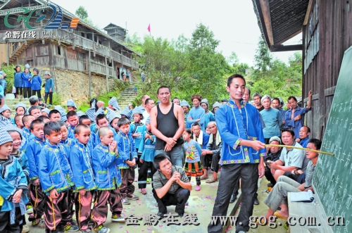 9月12日,榕江縣塔石瑤族水族鄉同流村水族群眾身著節日盛裝,載歌載舞,歡慶該縣水漢雙語教學試點班在此開班。