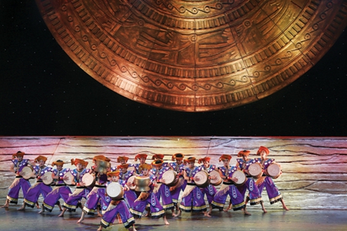 在貴陽(yáng)國(guó)際會(huì)議中心,表演者以苗族“三鼓一笙”中的“三鼓”(木鼓、銅鼓、皮鼓)的敲擊聲作線,將《鼓道苗疆》中的《祭》、《耕》、《家》、《鼓》四個(gè)篇章串連在一起,演繹了苗族人千年的遷徙、在大山中辛勤勞作、繁育子孫的畫面。其中,第四篇章《鼓》中,六名女子以足當(dāng)槌,激起鼓聲點(diǎn)點(diǎn)的片段,贏得現(xiàn)場(chǎng)觀眾的熱烈掌聲。