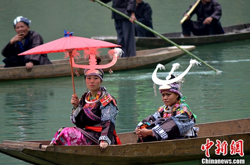 圖為船頭撐傘的苗族新娘。中新社發(fā) 趙剛 攝