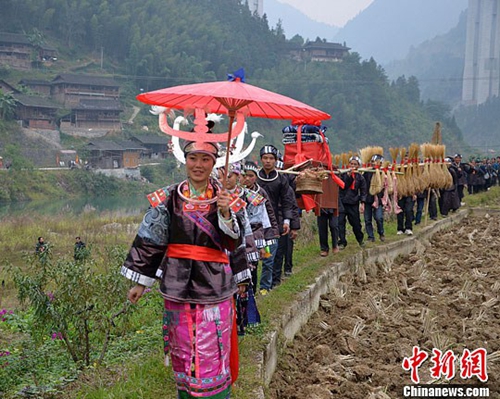 圖為10月下旬,一支送親隊(duì)伍行走在田間。中新社發(fā) 趙剛 攝