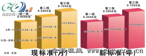據(jù)了解,自2012年7月1日起,貴州電網供電區(qū)域內實行“一戶一表”的城鄉(xiāng)居民用戶,試行階梯電價,居民生活用電每月用電量分為三檔,電價實行分檔遞增。考慮一般季節(jié)和冬季用電需求的不同,4-11月份,第一檔電量劃分標準為每戶月用電量170千瓦時(含)以內,第二檔電量劃分標準為每戶月用電量170-310千瓦時(含),第三檔電量劃分標準為每戶月用電量310千瓦時以上;12月至次年3月,第一檔電量劃分標準為每戶月用電量210千瓦時(含)以內,第二檔電量劃分標準為每戶月用電量210-380千瓦時(含),第三檔電量劃分標準為每戶月用電量380千瓦時以上。