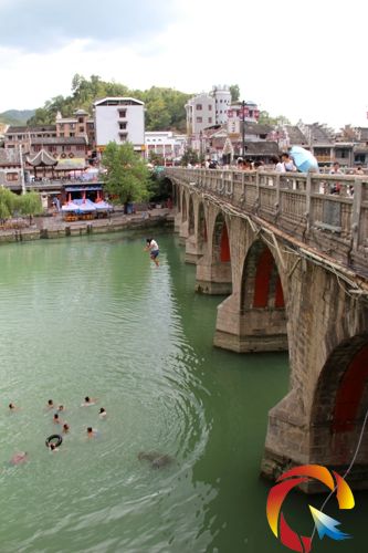 鎮遠縣城新大橋位于縣城中央,舞陽河上,橋欄距離水面10米左右。15時許,只見3名約10—12歲的未成年人坐在橋欄上,嘻嘻哈哈,相互慫恿跳橋。這個說:“你跳啊,敢跳嗎?”那個說:“你敢嗎?你敢我就敢。”在一旁執勤的鎮遠交警見狀趕來勸阻,剛說了句:“快下來,危險,不要跳...”話音未落,就聽得“嗵”的一聲,在眾目睽睽之下,一黑膚黑褲男孩縱身一躍,飛身跳入河中,水花還未散盡就已鉆出水面,面不改色。見此情景,穿藍褲的男孩也不甘示弱,使了招“秤砣落水”,緊接著跳下。見藍褲男孩也沒有什么事,最后一名白衣女孩“巾幗不讓須眉”,大叫一聲一躍而下,激起巨大浪花,在眾人一片驚呼聲中安然露出水面,開心而笑。