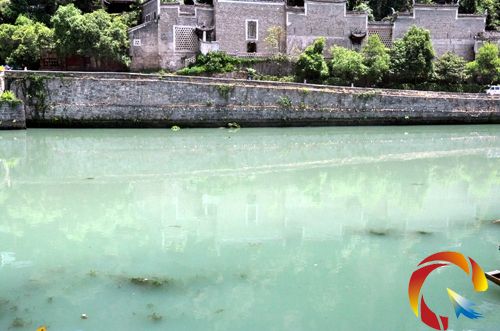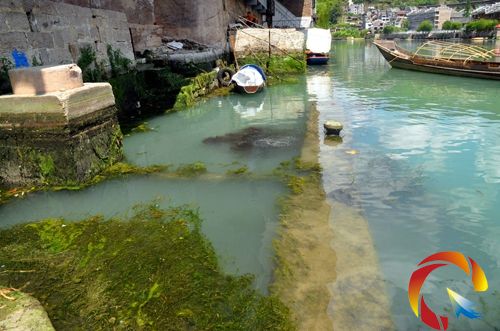 8月12日中午,記者沿舞陽(yáng)河縣城河段進(jìn)行了采訪。祝圣橋是鎮(zhèn)遠(yuǎn)古城區(qū)的標(biāo)志性景點(diǎn),以往,舞陽(yáng)河水清亮?xí)r,祝圣橋倒影在水中,十分壯觀。如今水體顏色變樣,一片渾濁,祝圣橋倒影在水中的影子變得模模糊糊……在靠近岸邊的地方,還長(zhǎng)出了大片水草,記者靠近它們,一陣腥臭味撲鼻而來(lái)。
