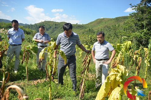 縣長羅杰(左起三)在田間查看烤煙受災情況 (楊淋光 攝)