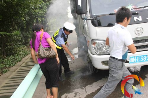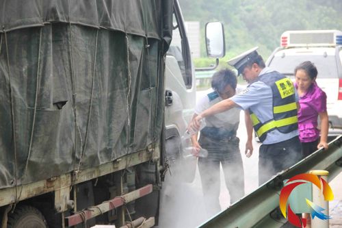 聽到警笛,貨車前行了300米,停靠在應急車道上,此時煙越來越大,輪胎已經有開始燃燒的跡象,情況十分危急,見狀民警迅速將警車上攜帶的一箱礦泉水般了下來,澆滅了冒煙的輪胎上的火苗。經檢查,在車輛高速行駛的情況下,輪豰與剎車鐵片相摩擦,輪豰溫度飆升,高溫使橡膠輪胎自燃冒煙。這種情況下很肯能導致車輛輪胎爆裂或是自燃,引發重大交通事故。民警及時發現制止,消除了重大安全隱患,遏制了一起重大交通事故的發生。