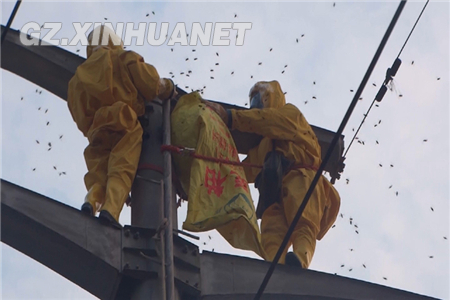 消防官兵到場后發(fā)現(xiàn)馬蜂窩“駐扎”在高壓線桿30多米高的頂部,周圍還有不少馬蜂正在活動(dòng),嚴(yán)重威脅到電力施工人員及過往人員的安全。在對現(xiàn)場有了基本的了解后,為了既能保證安全,又能成功把“蜂患”清除掉,官兵們經(jīng)過反復(fù)考慮,制定詳細(xì)的方案,現(xiàn)場指揮員下達(dá)作戰(zhàn)命令:警戒組做好警戒,疏散周圍圍觀群眾,提醒周邊居住村民關(guān)好門窗,防止馬蜂亂飛傷人。兩名經(jīng)驗(yàn)豐富的官兵穿上防蜂服,登上電桿鏟除蜂窩,當(dāng)消防官兵剛接近蜂窩時(shí),蜂巢內(nèi)的馬蜂像受了刺激一樣迅速涌出,將兩名消防官兵重重包圍起來,并展開進(jìn)攻,兩名消防官兵配合默契,迅速對蜂窩進(jìn)行清理。經(jīng)過30分鐘的激戰(zhàn),巨型馬蜂窩被成功鏟除。(唐代科)