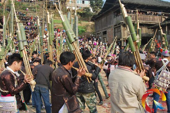 據悉蘆笙節是從江縣雍里鄉、谷坪鄉、斗里鄉、翠里鄉、西山鎮、丙妹鎮、下江鎮等苗族村寨一年一度慶祝豐收歡慶新年古老傳統的節日。在雍里鄉共有七堂蘆笙節,每年蘆笙節從農歷十一月十九日即岜沙苗寨起堂,古時在雍里鄉有岜沙、龍江、大洞、滾玉、大塘五個村寨結盟并有“五堂”蘆笙之說,大洞村十二月初二為第三堂,滾玉村十二月初七為第四堂(不算閏月),大塘村十二月十九日第五堂蘆笙。蘆笙節當日,滾玉村90多支蘆笙及堯等村的30多支蘆笙匯聚到滾玉蘆笙堂齊吹,笙聲沸天,蘆震山岳,花炮及爆竹雷鳴,觀眾們熱烈喝彩,歡呼聲此起彼伏,熱鬧非凡、場面尉為壯觀。