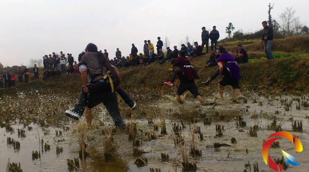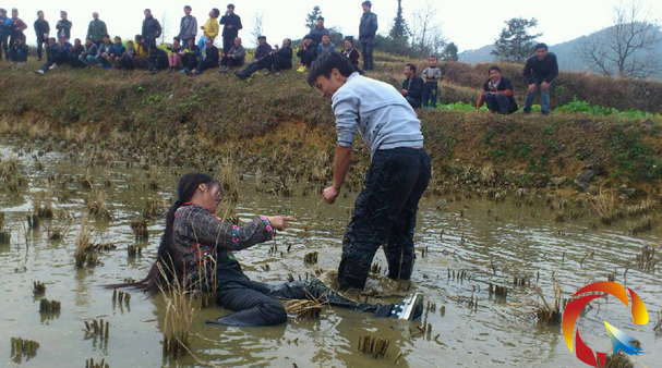 除了傳統的賈理頌唱外,春運會上,一些老少皆宜的運動項目也精彩紛呈。在背老婆過水田項目中,就以其濃厚的趣味性,引起了大家的格外關注。只見,報名參賽的夫妻,顧不上嚴寒,都挽起了褲腿,在水田上競相角逐。更有夫妻倆配合不力,摔倒在水田上的,淌了一身泥水,引得圍觀群眾哄堂大笑。