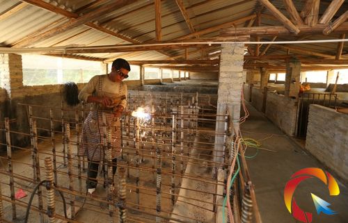 余世才的養殖場內,一名工作正在焊接母豬生產定位欄