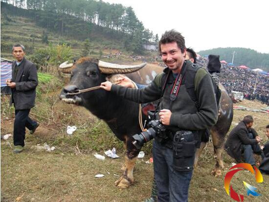 這位加拿大友人40多歲,在斗牛大賽舉辦時,他提著相機作壁上觀,拍下了很多牛王爭霸的照片。比賽結束之后,他走到一頭牛王的跟前,要求與之合影留戀,牛主答應了,這位老外手舞足蹈,非常高興。接著他把相機交給牛主,請求牛主幫忙拍攝,自己則拉起牛頭上的韁繩,做出了拉牛的姿勢……牛主迅速按下了快門。