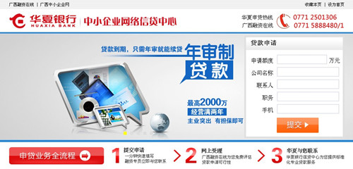 在華夏銀行中小企業網絡信貸中心,客戶一分鐘網上快速填寫融資申請,廣西融資在線融資專員為華夏銀行受理申請,立即聯系并在線上收集企業資料,實現融資信息對接,為客戶免費評估貸款申請可行性。后期的線下聯系,信貸中心將根據廣西融資在線整合的信息,為客戶提供標準化專業貸款服務。
