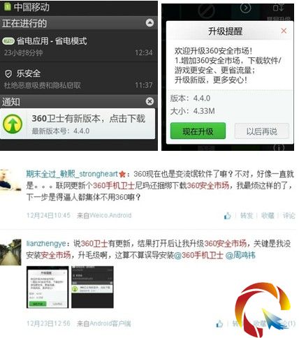 據(jù)網(wǎng)友的微博顯示,當用戶在手機通知欄接到360手機衛(wèi)士的升級提醒后,點擊卻發(fā)現(xiàn)這一升級提醒實際是360安全市場的升級提醒。進一步剖析,用戶本身沒有安裝360安全市場,但功能按鈕只有一個“現(xiàn)在升級”。可見,360為了達到誘導用戶安裝目的,還將“下載應用”按鈕變成了“現(xiàn)在升級”按鈕,讓用戶誤以為是對手機中已經(jīng)安裝的應用進行升級,此做法對用戶的誤導性極強。