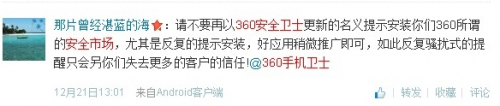 對此,微博達人“那片曾經(jīng)湛藍的海”在微博中公開向360手機衛(wèi)士呼吁,請不要再以360安全衛(wèi)士更新的名義,提示安裝所謂的安全市場,尤其是反復的提示安裝。好應用稍微推廣即可,如此反復騷擾式的提醒只會令你們失去更多用戶的信任。